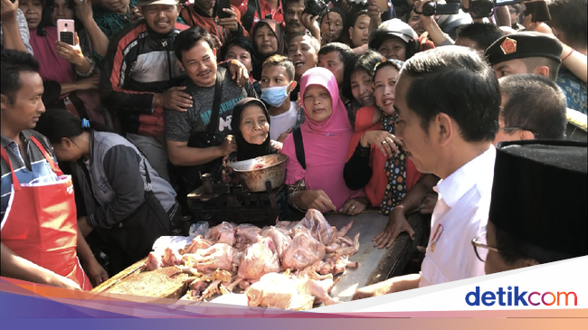 Jokowi kemudian mampir ke kios penjual ayam potong. Jokowi memborong Rp 5 kg ayam yang harga perkilogramnya Rp 31.000.
