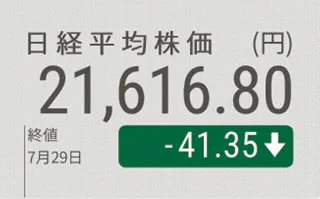 29日の東京株式市場で日経平均株価は続落し、前週末比41円35銭(0.19%)安の2万1616円80銭で終えた。26日発表の19年4~6月期決算で業績低迷が浮き彫りとなった銘柄への売りが相場の重荷となった。韓国株など、アジア株が総じて安く推移したことも嫌気された。東証1部の売買代金は1兆7443億円と、7日連続で2兆円を下回った。