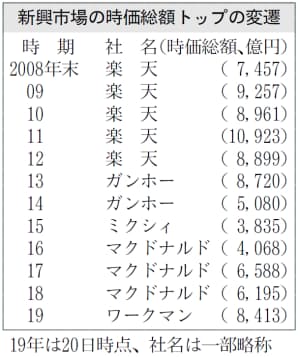 新興市場の時価総額上位の顔ぶれが変わってきた。17日には作業服販売のワークマンが上場来高値を付け、時価総額は8600億円に達した。上位にはかつて常連だったネットやゲーム企業が減り、小売りの勝ち組など利益を出しながら着実に成長している企業になってきた。赤字を脱却できない新興企業も多く、投資家が堅実路線に転換している。