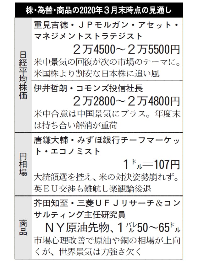 金融市場の方向性を決めると身構えられていた米中貿易交渉と英国の欧州連合(EU)離脱問題が進展し、市場に世界景気持ち直しへの期待感が強まっている。株式市場では日経平均株価が2018年に付けたバブル経済崩壊後の戻り高値(2万4270円)を上回るとの見方が増えている。もっとも、米中も英EUも貿易交渉には曲折が予想され、失望を招く局面もあるとみられている。