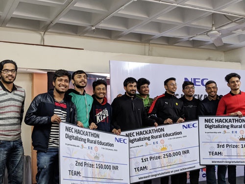 NECがインドで展開するハッカソンイベント。インド地方農村部の居住者を想定したデジタル教育をテーマに開催された。社会人参加者も多いが、入賞した3チームは全て大学生チームだった。