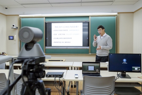 生徒に向けて教師がオンライン授業(写真:新華社/アフロ)
