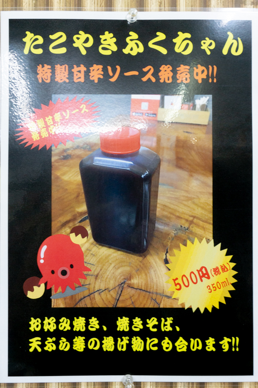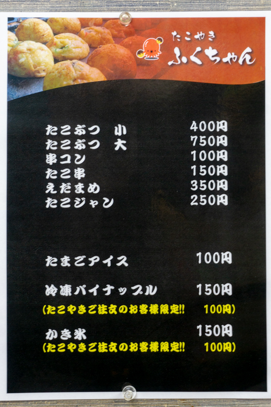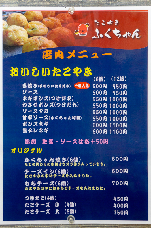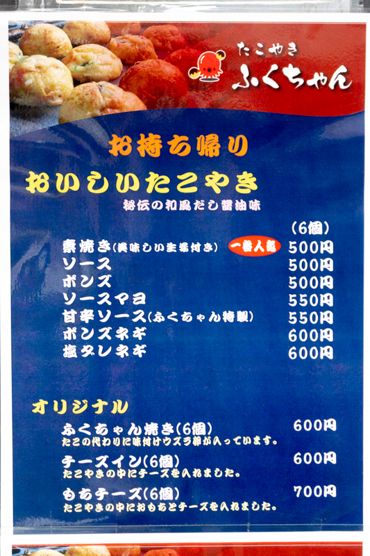 素焼きを含め7種類の味と、オリジナルメニューのたこの代わりにうずら卵が入ったふくちゃん焼などが。