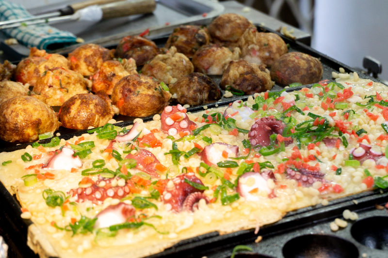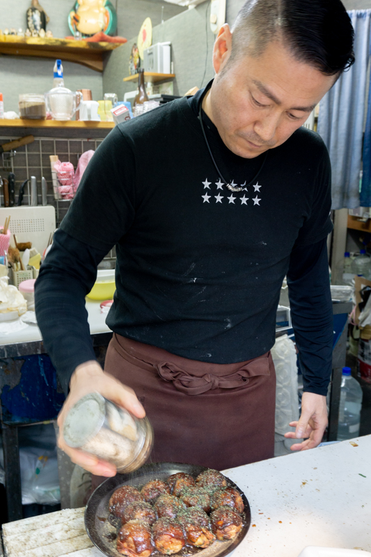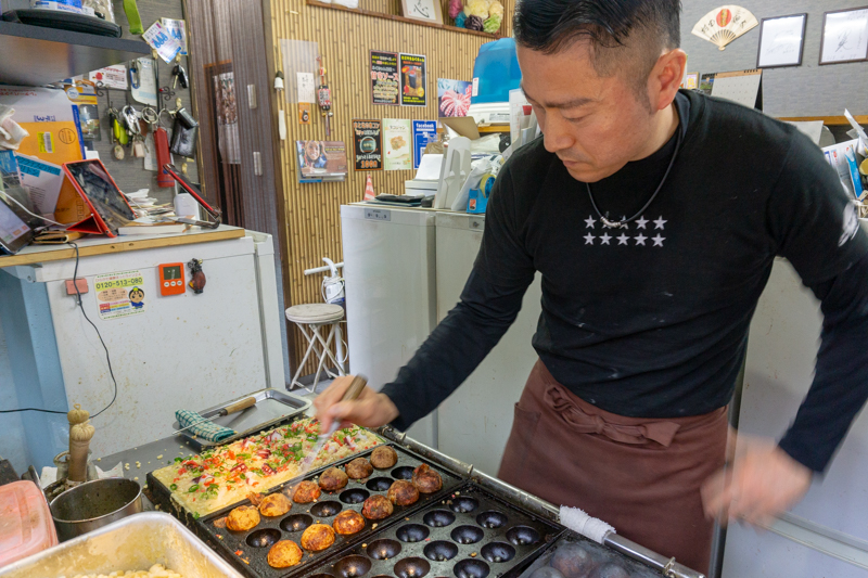 店主さんが市場から仕入れた新鮮なタコが、アツアツの生地に包まれていきます。