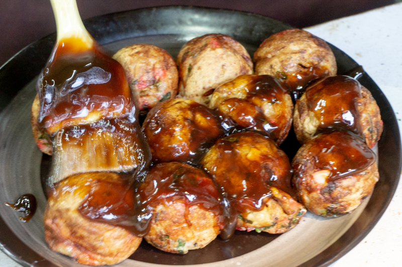焼き上げたたこ焼きを大皿に並べ、たっぷりとふくちゃん特製甘辛ソースをかけます。