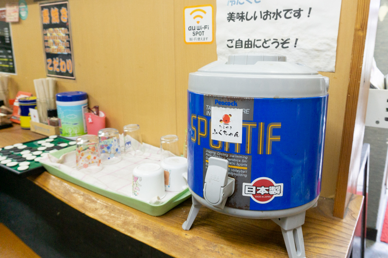 カウンターにはセルフのお水。こども用のプラスチック製コップも用意されています。