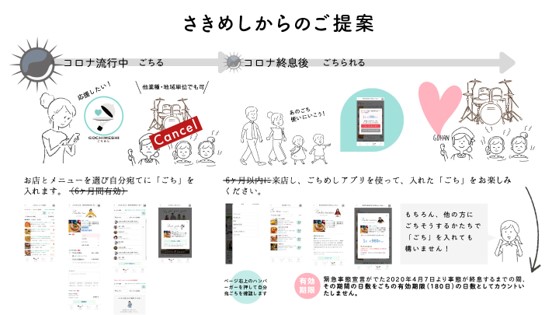 「ごちめし」では、新型コロナウイルスの影響で予約や来店客が減少している飲食店のサポートとして、「ごちる」機能を活用した支援を広げています。「さきめし」と題した取り組みで、コロナウイルスの影響で直近はお店に出向くのを遠慮している方が、そのお店のメニューを選んで自分あてに食事代を先払いしておき(=自分へ「ごち」を入れ)、終息後に来店してアプリを使って入れた「ごち」で食事をしていただくことで、お店に行けなくても応援の気持ちを伝え、苦境を超える手助けができます。