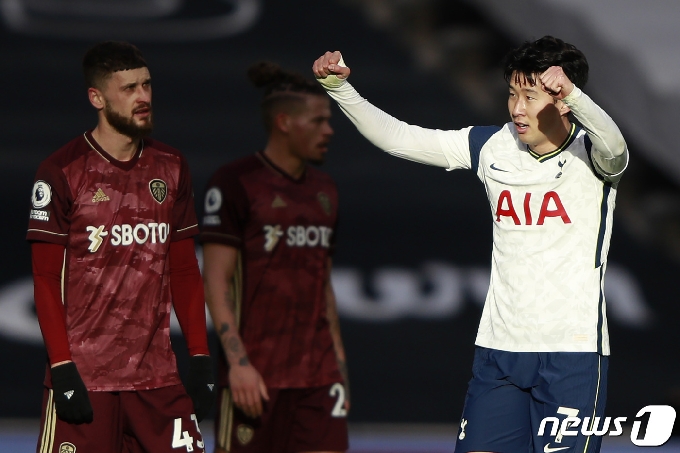 | 손흥민이 2일(한국시간) 리즈 유나이티드와의 경기에서 토트넘 통산 100번째 골을 터트린 뒤 기뻐하고 있다. © AFP=뉴스1 |