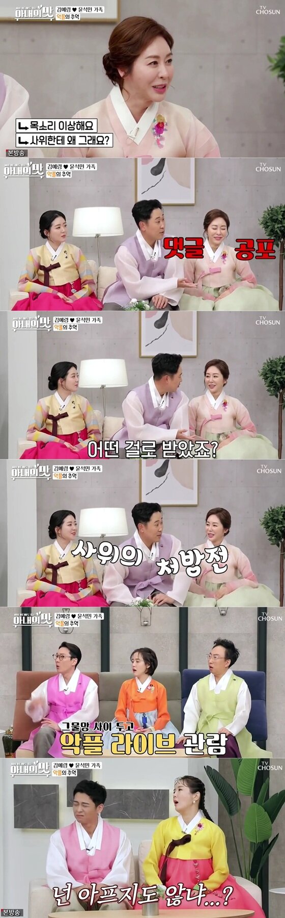 김예령은 "난 많다. 여러가지다. 목소리가 징그럽다는 둥 사위에게 끼부린다는 둥 그런 댓글이 있었다"고 속상한 심경을 내비쳤다.