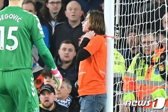 | 에버턴-뉴캐슬 경기장에 침입, 골대에 스스로 목을 묶은 환경론자. © AFP=뉴스1 |
